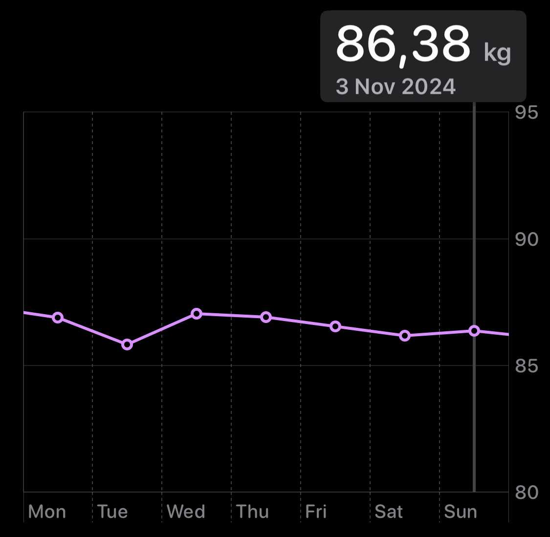 À l'heure où j'écris ces lignes, je suis à 86,2kg, la balance m'indique 30% de bodyfat, je pense qu'elle déraille un peu, le bodyfat fait beaucoup de yoyo, et m'indique des valeurs incohérentes d'un jour à l'autre (30% un jour, 25% le lendemain, etc etc), je vais essayer de me fier à la moyenne de tout ça.